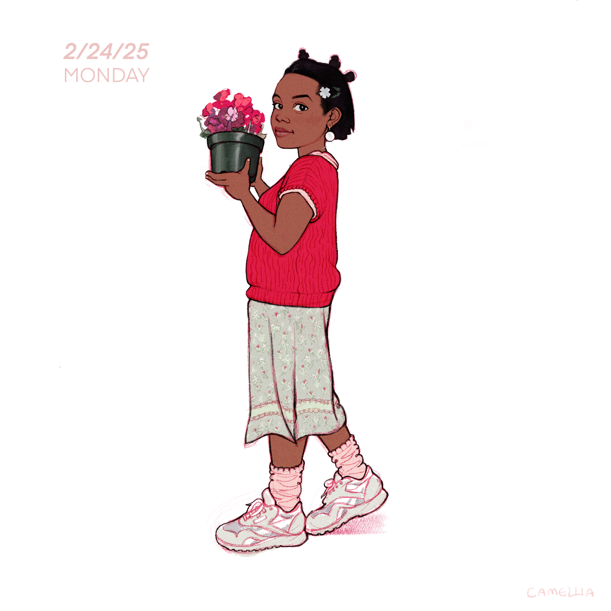 OOTD 2/24/25: red knitted top + vintage green floral skirt, 2025, digital